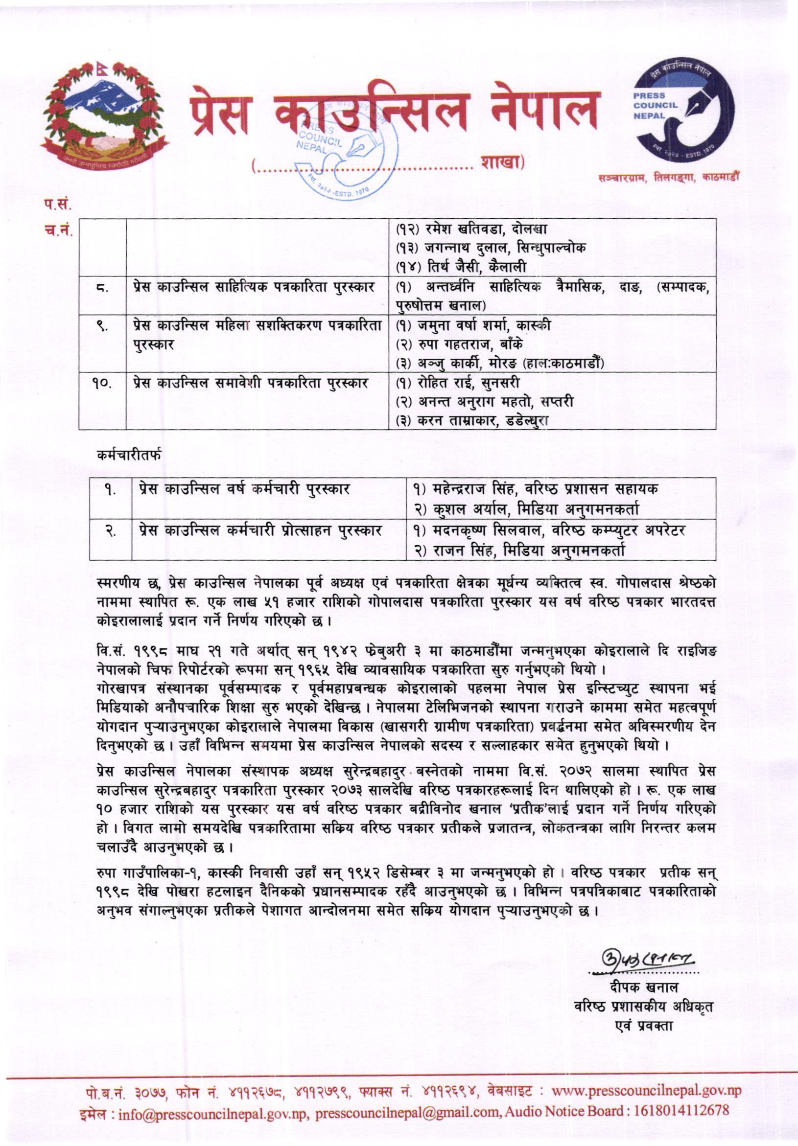 प्रेस काउन्सिल नेपालका पूर्व अध्यक्ष एवं पत्रकारिता क्षेत्रका मूर्धन्य व्यक्तित्व स्व. गोपालदास श्रेष्ठको नाममा स्थापित एक लाख ५१ हजार राशिको गोपालदास पत्रकारिता पुरस्कार तथा प्रेस काउन्सिल नेपालका संस्थापक अध्यक्ष सुरेन्द्रबहादुर बस्नेतको नाममा वि.सं. २०७२ सालमा स्थापित प्रेस काउन्सिल सुरेन्द्रबहादुर पत्रकारिता पुरस्कार २०७३ सालदेखि वरिष्ठ पत्रकारहरूलाई दिन थालिएको वरिष्ठ प्रशासकीय अधिकृत (प्रवक्ता) दीपक खनालद्धारा जारी विज्ञप्तिमा जनाइएको छ ।