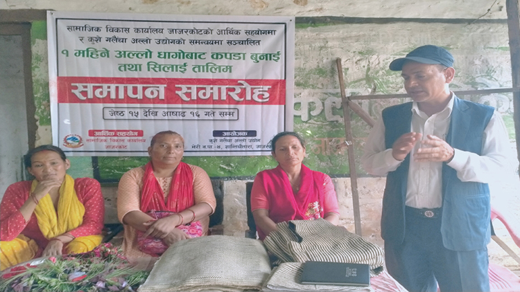 अल्लो धागोको १ महिने कपडा बुनाई तथा सिलाई लालिम बिहिबार समापन भएको छ । सामाजिक विकास कार्यालय, जाजरकोटको आर्थिक सहयोमा संचालन भएको एक महिने उक्त तालिम भेरी नगरपालिका–४ शान्तिचौतारामा समापन भएको हो ।