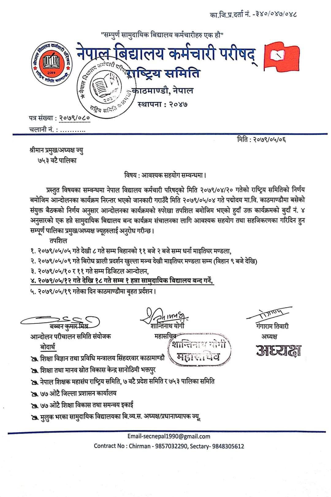 यहि भदौं १२ गतेदेखि १८ गतेसम्म जाजरकोट जिल्लाका सबै सामुदायिक विद्यालयहरु बन्द गर्न नेपाल विद्यालय कर्मचारी परिसद जिल्ला समिति जाजरकोटले आईतबार विद्यालय प्रअहरुलाई परिपत्र गरेको छ । विद्यालय प्रअलाई सम्बोधन गरिएको परिपत्रमा नेपाल विद्यालय कर्मचारी परिसद जिल्ला समिति जाजरकोटका अध्यक्ष बिरेन्द्र कुमार रानाले हस्ताक्षर गरेका छन् । अध्यक्ष रानाद्धारा हस्ताक्षर गरिएको परिपत्रको बोधार्थमा शिक्षा विकास तथा समन्वय इकाई, जिल्लाका सात वटै पालिकाका शिक्षा युवा तथा खेलकुद शाखा, नेपाल शिक्षक ममहासंघमा आबद्ध घटक, संघसंगठनहरु, जिल्लाका सवै प्रधानाध्यापक र विव्यस अध्यक्षहरुलाई सम्बोधन गरिएको छ । उक्त परिपत्रमा एक हप्ता विद्यालय बन्द गर्न सहयोग गर्न सवैलाई अनुरोध गरिएको छ ।