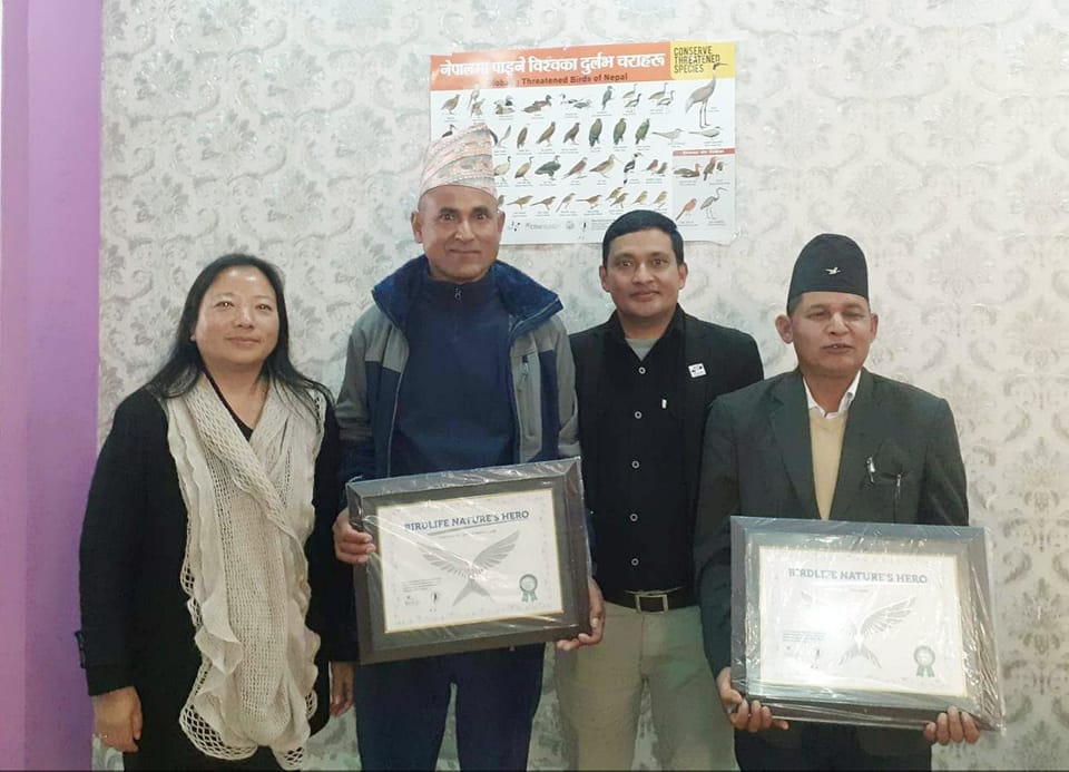 स्थानीय स्तरमा रहेर जंगली जनावर, चरा र तिनको संरक्षण तथा बासस्थान संरक्षणमा उल्लेख्य स्वयमसेवी योगदान पुरयाउने जाजरकोटका सिंह र बर्दियाका राम शाहीलाई बर्डलाइफ प्रकृति नायकको उपाधीबाट सम्मानित गरिएको हो । प्रकृतिको संरक्षण, जीबजन्तु र पशुपंक्षीको संरक्षण, खोज र अनुसन्धानमा महत्वपुर्ण योगदान पुरयाउने दुई जनालाई प्रकृतिका हिरो अवार्डबाट सम्मानित गरिएको पंक्षी संरक्षण संघका अध्यक्ष डा. करण शाहले बताए ।