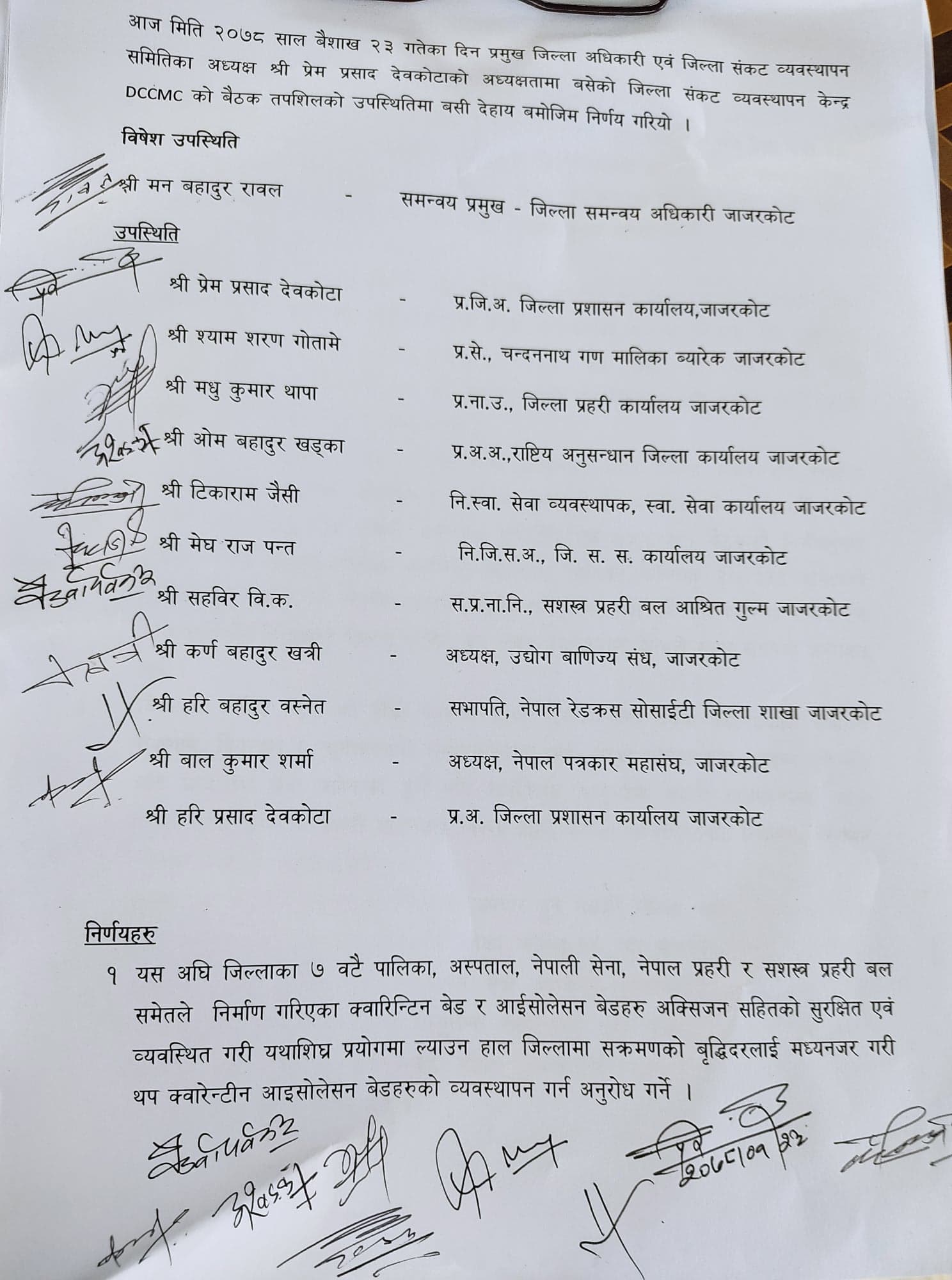 त्यसैगरी जिल्ला संकट व्यवस्थापन समितिको बैठकले जिल्लाका सात वटै पालिका, अस्पताल, नेपाली सेना, नेपाल प्रहरी र सशस्त्र पहरी बलले यस अघि नै निर्माण गरेका क्वारिन्टिन र आइशोलेसन बेडहरुलाई अक्सिजन सहितको सुरक्षित र व्यवस्थित रुपमा प्रयोगमा ल्याउनुको साथै जिल्लामा संक्रमितहरुको बृद्धिदरलाई मध्यनजर गरी थप क्वारिन्टिन र आइशोलेसनको व्यवस्थापन गर्न अनुरोध गर्ने निर्णय गरिएको प्रमुख जिल्ला अधिकारी प्रेमप्रसाद देवकोटाले बताए । जिल्लाका सबै पालिकाहरुलाई न्युनतम पनि २० बेड क्षमता भएका आइशोलेसनहरु निर्माण गर्न अनुरोध गर्ने बैठकले निर्णय गरेको छ प्रजिअ देवकोटाले भने–‘जिल्लामा तिब्र गति लिईरहेको कोभिड–१९ को रोकथाम, नियन्त्रण तथा उपचारलाई सहज बनाउन यही बैसाख २५ गते राती १२ बजेसम्म गरिएको निषेधाज्ञालाई आगामी जेठ १ गते राती १२ बजेसम्म थप गर्न बैठकले जिल्ला सुरक्षा समितिलाई अनुरोध गर्ने निर्णय गरेको छ ।’