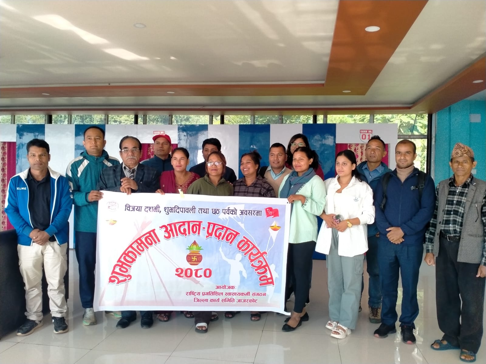 नेपाल कम्युनिष्ट पार्टी (माओवादी केन्द्र) निकट राष्ट्रिय प्रगतिशिल स्वास्थ्यकर्मी संगठनले शुभकामना आदानप्रदान गरेको छ । बडा दशै, शुभदीपावली, नेपाल सम्वत् ११४४ तथा छठपर्व २०८० को अबसरमा राष्ट्रिय प्रगतिशिल स्वास्थ्यकर्मी संगठन जिल्ला कार्यसमिति, जाजरकोटले बुधबार जिल्ला सदरमुकाम खलंगामा शुभकामना आदानप्रदान गरेको हो ।