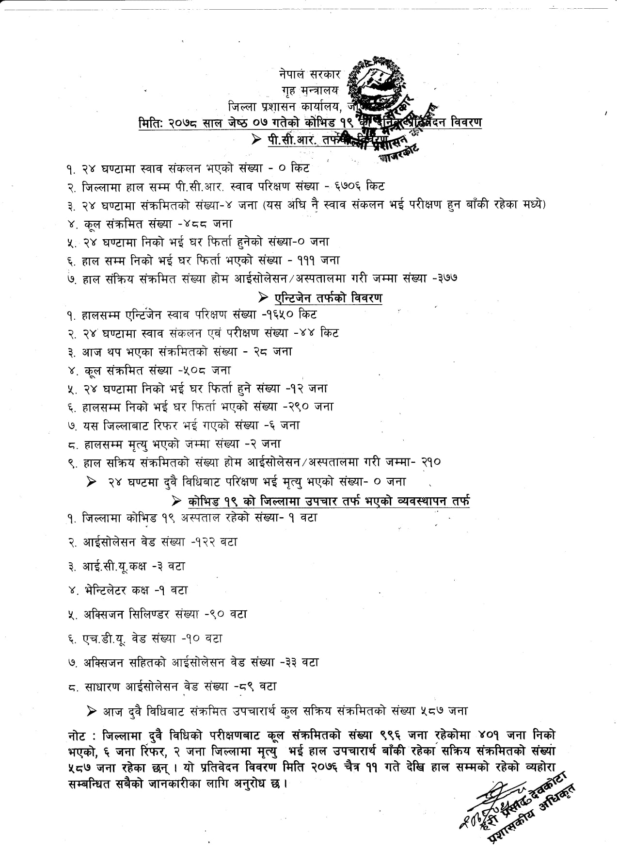 नगर स्वास्थ्य शाखाले शुक्रबार प्रकाशन गरेको कोभिड–१९ को दैनिक प्रतिवेदन विवरणमा हालसम्म २ जनालाई गरिएको पिसीआर परिक्षण रिर्पोटले २ जनालाई नै कोरोना संक्रमित नभएको पुष्टी भएको छ । त्यसैगरी ६० जनालाई गरिएको एन्टीजेन परीक्षणबाट २७ जनालाई कोरोना पुष्टी भएको दैनिक प्रतिवेदन बिबरणमा देखाईएको छ । १२ जना सक्रिय संक्रमितले होम आईशोलेसनमा रहेर उपचार गराई रहेका छन् भने, २ जना सक्रिय संक्रमितले प्राथमिक स्वास्थ्य केन्द्र दल्लीको आईशोलेसनमा रहेर उपचार गराई रहेका छन् । ७ जना डिस्चार्ज भएका छन् भने, ५ जनालाई रिफर गरिएको छ । हालसम्म एक जनाको मृत्यु भएको छ ।