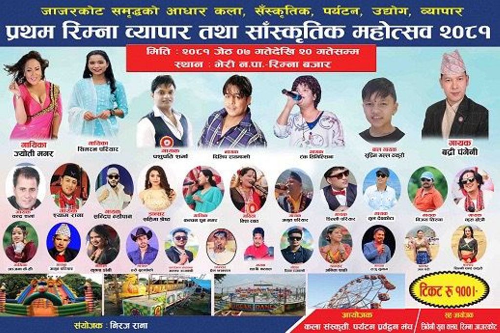 भेरी नगरपालिका–१ रिम्नामा रिम्ना पर्यटन, व्यापार तथा साँस्कृतिक महोत्सव संचालन हुने भएको छ । रिम्ना पर्यटन, व्यापार तथा साँस्कृतिक महोत्सव–२०८१ को मुल आयोजक समितिमा कला, संस्कृति, पर्यटन प्रवद्र्धन मञ्च कर्णाली प्रदेश सुर्खेत रहेको छ ।