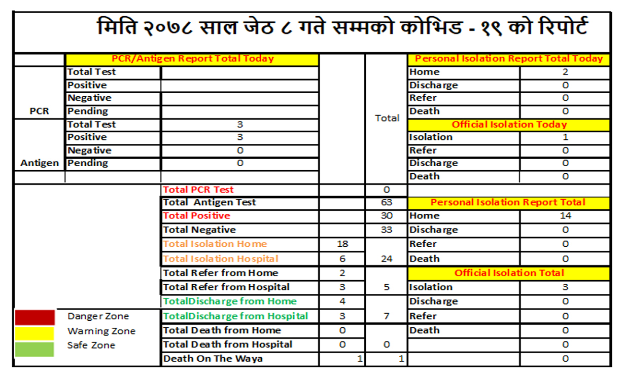 जिल्ला स्थित कोभिड–१९ संकट व्यबस्थापन केन्द्रका संयोजक तथा प्रमुख जिल्ला अधिकारी प्रेमप्रसाद देवकोटाको निर्देशनमा जिल्ला प्रशासन कार्यालय, जाजरकोटले कोभिड–१९ को दैनिक प्रतिवेदन बिबरण सार्बजनिक गर्दै आएको छ ।