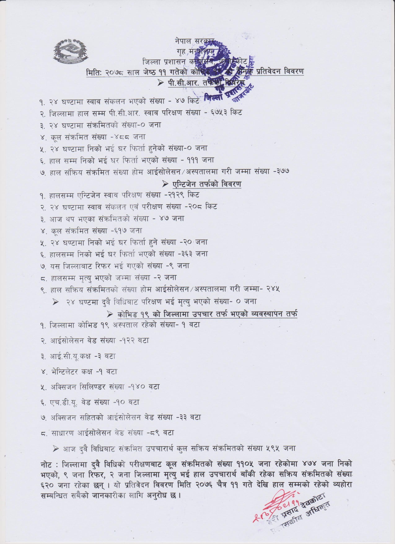 नलगाड नगरपालिकाले मंगलबार प्रकाशन गरेको कोभिड–१९ को दैनिक प्रतिवेदन विवरणमा हालसम्म ८९ जनालाई गरिएको एन्टीजेन परीक्षणबाट ४७ जनालाई कोरोना पुष्टी भएको उल्लेख गरिएको छ । हालसम्म ५ जनालाई थप उपचारको लागि रिफर गरिएको छ भने, ८ जना डिस्चार्ज भएका छन् । हालसम्म एक जनाको मृत्यु भएको छ । मंगलबार २२ जना सक्रिय संक्रमितले होम आईशोलेसनमा रहेर उपचार गराई रहेका छन् भने, ९ जना सक्रिय संक्रमितले नगरपालिकाको आईशोलेसनमा रहेर उपचार गराई रहेका छन् । मंगलबार नलगाड नगरपालिकामा ३१ जना सक्रिय संक्रमित रहेका छन् ।