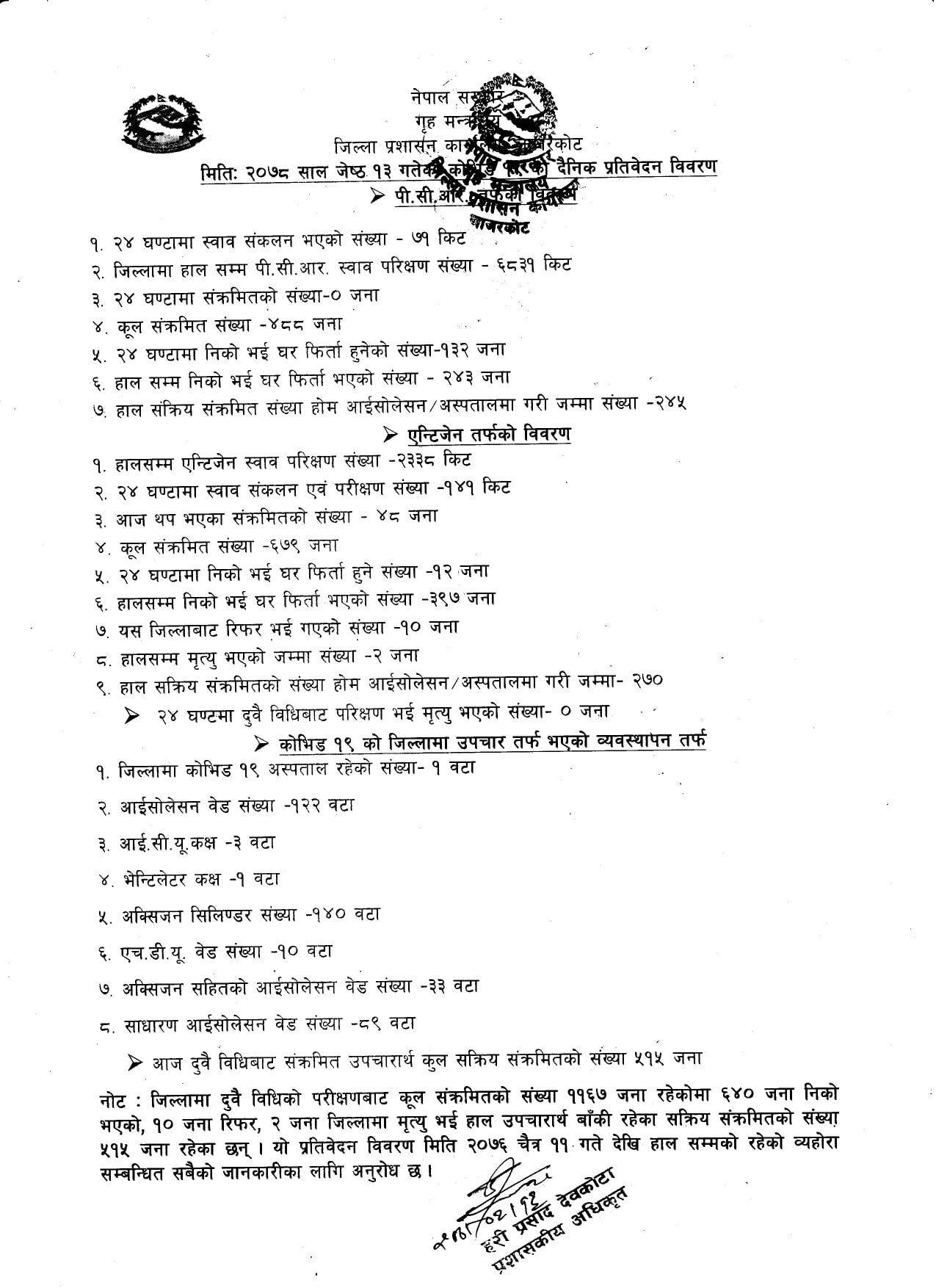 हालसम्म ९८ जनालाई गरिएको एन्टीजेन परीक्षणबाट ५१ जनालाई कोरोना पुष्टी भएको प्रतिवेदन विवरणले देखाएको छ । हालसम्म ८ जनाले कोरोना जितेर डिस्चार्ज भएका छन् भने, ७ जनालाई थप उपचारको लागि रिफर गरिएको छ । एक जना संक्रमितको मृत्यु भएको थियो । बिहिबार नलगाड नगरपालिकामा २७ जना सक्रिय सक्रिमितले आईशोलेसनमा रहेर उपचार गराई रहेका छन् । २७ जना सक्रिय संक्रमितहरु मध्ये १८ जना सक्रिय संक्रमितले होम आईशोलेसनमा रहेर उपचार गराई रहेका छन् भने, ९ जना सक्रिय संक्रमितले नगरपालिकाको आईशोलेसनमा रहेर उपचार गराई रहेका छन् ।