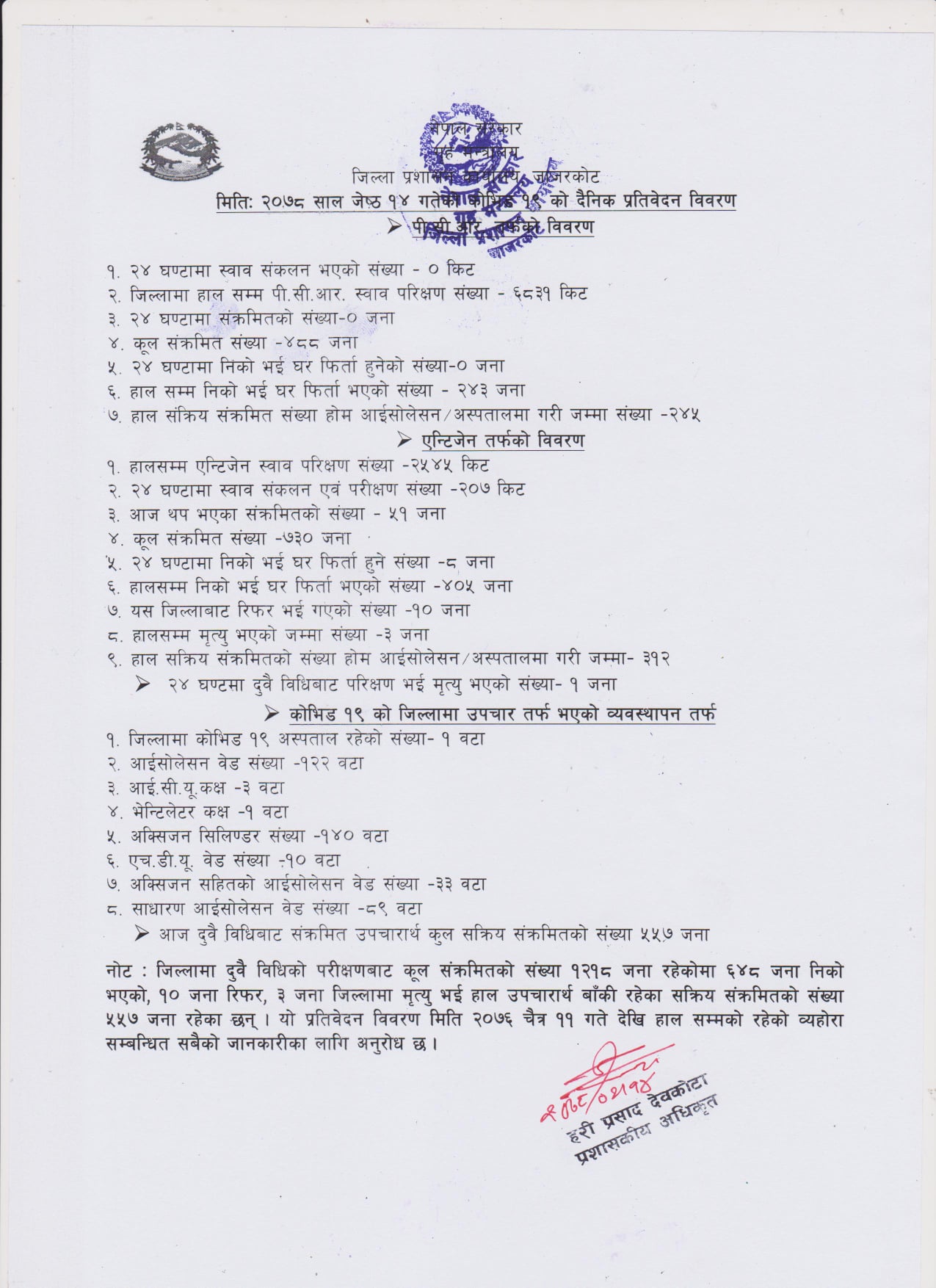 दैनिक रुपमा कोभिड–१९ को प्रतिवेदन विवरण प्रकाशन गर्दै आएको नलगाड नगरपालिकाले शुक्रबार यो समाचार तयार पार्दासम्म दैनिक प्रतिवेदन बिबरण प्रकाशन गरेको छैन । त्यसैगरी कुशे, शिवालय र जुनीचाँदे गाउँपालिकाले पनि शुक्रबार कोभिड सम्बन्धि आधिकारीक जानकारी दिएका छैनन् ।