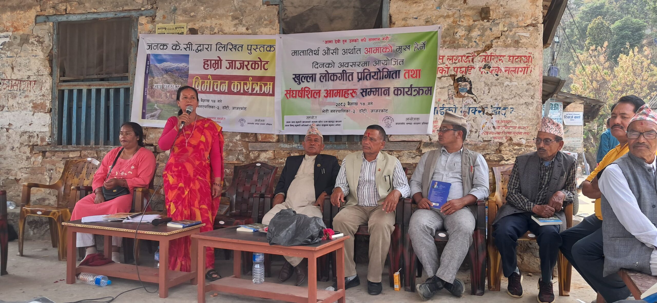 मातातिर्थ औंसी तथा आमाको मुख हेर्ने दिनको अबसरमा जाजरकोटमा १५ जना संघर्षशिल आमाहरुलाइ सम्मान गरिएको छ भने, आमाप्रति समर्पित खुल्ला लोकगीत प्रतियोगिताको आयोजना गरिएको छ । जाजरकोट सम्पदा संरक्षण प्रतिष्ठानको आयोजनामा १५ जना संघर्षशिल आमाहरुलाइ सम्मान गर्नुको साथै खुल्ला लोकगीत प्रतियोगिताको आयोजना गरिएको हो ।