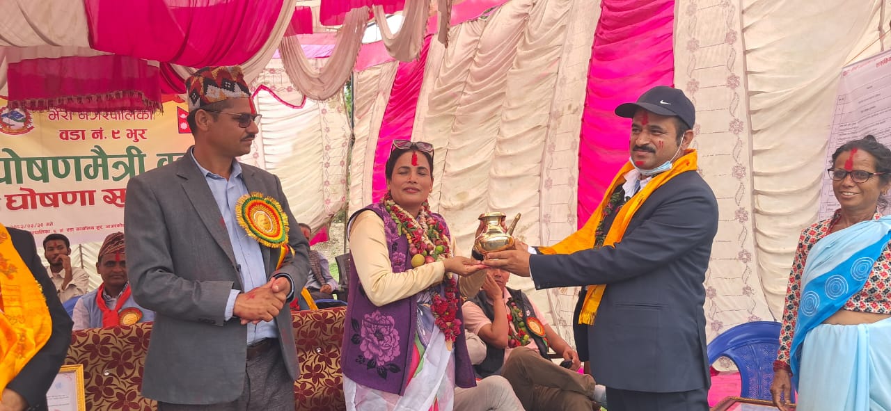 भेरी नगरपालिका–९ का वडा अध्यक्ष हिरा प्रसाद शर्माको अध्यक्षतामा आयोजित औपचारिक कार्यक्रमको व्यानर पढेर जिल्ला समन्वय समिति, जाजरकोट प्रमुख कालि बहादुर खत्रीले उक्त वडालाइ पोषणमैत्री वडा घोषणा गरेका थिए । पोषणमैत्री स्वास्थ्यका सुचक, शिक्षाको क्षेत्र, महिला तथा बालबालिकाको क्षेत्र, खानेपानी तथा सरसफाइको क्षेत्र, कृषि, भेटनरी र खाद्य सुरक्षाका सुचकहरु पुरा गरेपछि भेरी नगरपालिका–९ लाइ पोषणमैत्री वडा घोषणा गरिएको नगर स्वास्थ्य शाखामा कार्यरत पोषण फोकलपर्सन कौशिला बटालाले जानकारी दिएकी थिइन् ।