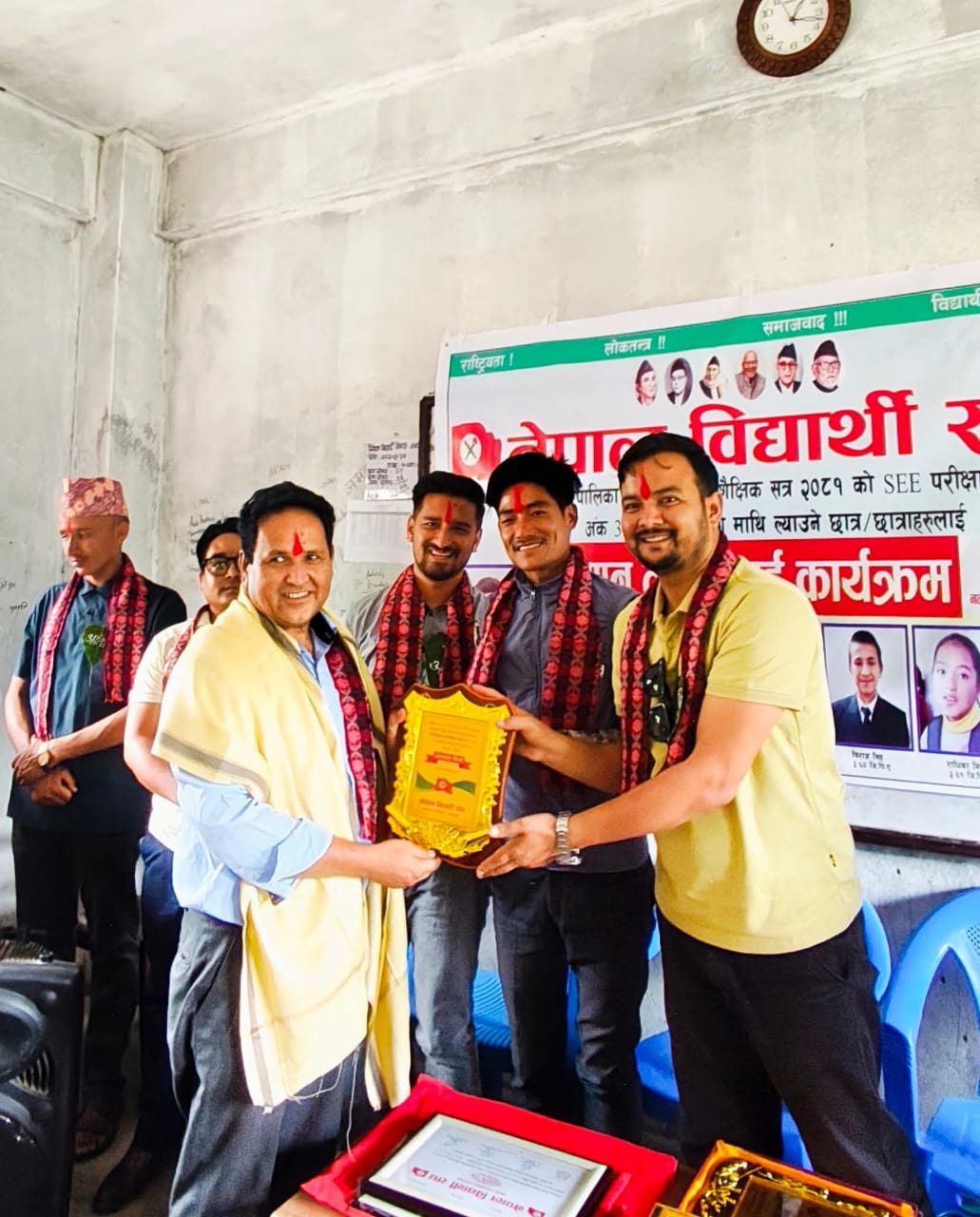 नलगाडबाट एसइइ परीक्षामा उत्कृष्ट नतिजा हासिल गरेका उक्त विद्यार्थीहरुलाइ नेविसंघले दोसल्ला, सम्मान–पत्र सहित नगद पुरस्कार प्रदान गरेर सम्मान गरेको सभापति पुनले जानकारी दिएका छन् । त्यसैगरी नेविसंघ नलगाड नगर समितिले त्रिभुवन माध्यामिक विद्यालय दल्ली र विरेन्द्र हिमालय माध्यामिक विद्यालय तल्लुलाइ सम्मान गरेको थियो ।