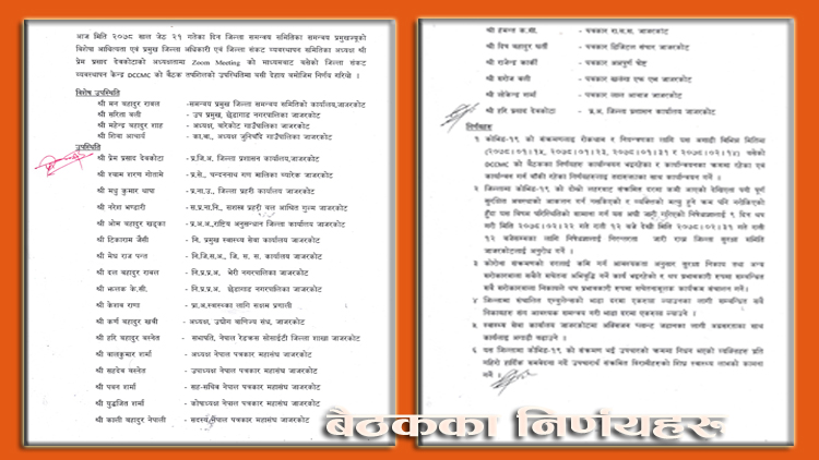 जिल्ला समन्वय प्रमुख मन बहादुर रावल, छेडागाड नगरपालिका उपप्रमुख सरिता वली, बारेकोट गाउँपालिका अध्यक्ष महेन्द्र बहादुर शाह, जुनीचाँदे गाउँपालिका कावा अध्यक्ष शिवा आचार्यको बिशेष उपस्थिति रहेको बैठकमा चन्दननाथ गण मालिका व्यारेका प्रमुख सेनानी श्याम शरण गोतामे, प्रहरी नायव उपरिक्षक मधुकुमार थापा, सशस्त्र प्रहरी बल आश्रित गुल्म जाजरकोटका प्रहरी नायव निरिक्षक नरेश भण्डारी, प्रमुख अनुसन्धान अधिकृत ओम बहादुर खड्का, स्वास्थ्य सेवा कार्यालय, जाजरकोटका निमित्त व्यवस्थापक टीकाराम जैसी, निमित्त जिल्ला समन्वय अधिकारी मेघराज पन्त, भेरी नगरपालिकाका निमित्त प्रमुख प्रशासकीय अधिकृत दलबहादुर घर्ती, छेडागाड नगरपालिकाका निमित्त प्रमुख प्रशासकीय अधिकृत झलक केसी, स्वास्थ्यका लागि सक्षम प्रणालीका केशव राना, उद्योग बाणिज्य संघ, जाजरकोट अध्यक्ष कर्णबहादुर खत्री, नेपाल रेडक्रस सोसाईटी जाजरकोट सभापति हरि बहादुर बस्नेत, नेपाल पत्रकार महासंघ, जाजरकोट अध्यक्ष बालकुमार शर्मा, नेपाल पत्रकार महासंघ, जाजरकोट उपाध्यक्ष सहदेब बस्नेत, नेपाल पत्रकार महासंघ, जाजरकोट सह सचिब पवन शर्मा, नेपाल पत्रकार महासंघ, जाजरकोट कोषाध्यक्ष युद्धजीत शर्मा, नेपाल पत्रकार महासंघ, जाजरकोट सदस्य कालीबहादुर नेपाली, नेपाल पत्रकार महासंघ, जाजरकोट सदस्य रेशम खड्का, नेपाल पत्रकार महासंघ कर्णाली प्रदेश सदस्य सरोज वली, रासस सम्वाददाता हेमन्त केसी, डिजिटल संचार दीपबहादुर घर्ती, अन्नपूर्ण पोष्ट सम्वाददाता राजेन्द्र कार्की, लालआवाज साप्ताहिक लोकेन्द्रराज शर्मा र जिल्ला प्रशासन कार्यालय, जाजरकोटका प्रशासकीय अधिकृत हरि प्रसाद देवकोटाको उपस्थिति रहेको थियो ।