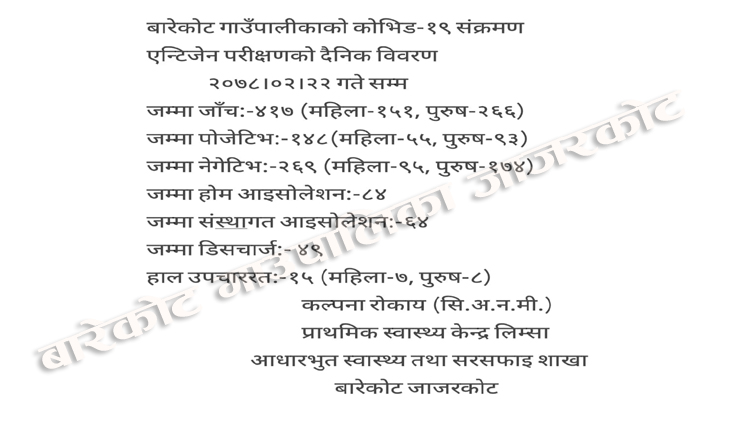 सनिबार १२ जनालाई गरिएको एन्टीजेन परीक्षणबाट ६ जनालाई कोरोना पुष्टि भएको प्राथमिक स्वास्थ्य केन्द्र लिम्सामा कार्यरत सिनियर अनमी कल्पना रोकायले जानकारी दिएकी छन् । हालसम्म बारेकोटमा ४१७ जनालाई गरिएको एन्टीजेन परीक्षणबाट १४८ जनालाई कोरोना पुष्टि भएको अनमी रोकायले बताएकी छन् । अनमी रोकायले लिएको जानकारी अनुसार हालसम्म कोरोना पुष्टि भएका १४८ जना मध्ये ५५ जना महिला रहेका छन् भने, ९३ जना पुरुष रहेका छन् ।