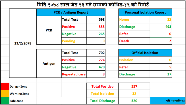 भेरी नगरपालिकामा आईतबारसम्म ५२० जनाले कोरोना जितेर डिस्चार्ज भएका छन् भने, ३२ जना सक्रिय संक्रमितले होम आइशोलेसनमा रहेर उपचार गराई रहेका छन् ।