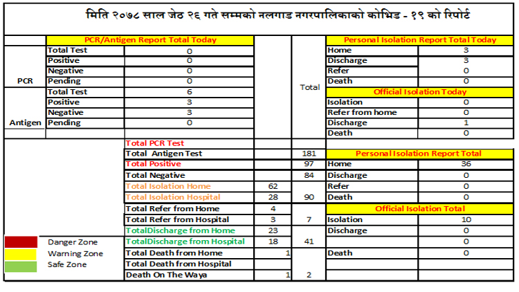 स्वास्थ्यकर्मीहरुको निगरानीमा बुधबार ३६ जना सक्रिय संक्रमितले होम आइशोलेसनमा रहेर उपचार गराई रहेका छन् भने, १० जना सक्रिय संक्रमितले संस्थागत आइशोलेसनमा रहेर उपचार गराई रहेको प्रकाशित दैनिक प्रतिवेदन विवरणले देखाएको छ । बुधबार नलगाड नगरपालिकामा ४६ जना सक्रिय संक्रमित रहेका छन् । थप उपचारको लागि ७ जनालाई रिफर गरेको नगरपालिकामा हालसम्म २ जना संक्रमितको मृत्यु भएको छ ।