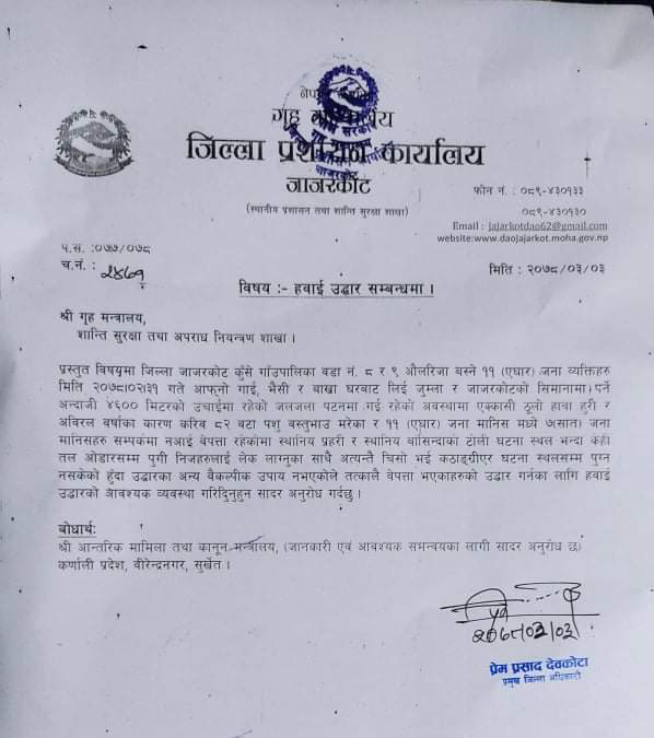 प्रमुख जिल्ला अधिकारी प्रेम प्रसाद देवकोटाद्धारा हस्ताक्षर गरिएको अनुरोध पत्रको बोधार्थ कर्णाली प्रदेशको आन्तरिक मामिला तथा कानुन मन्त्रालयलाई पनि जानकारी दिएको छ ।